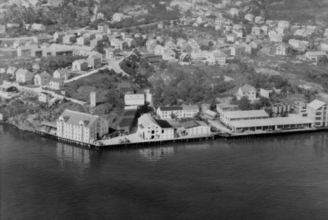 Tar vi turen nedover samme bakken helt ned til sjøkanten igjen og går videre mot høyre billedkant er vi på bedriften Ulrik Olsen A/S sitt område. En kan se at bedriften er bygd opp igjen etter den store brannen i 1954, som også er beskrevet nærmere under ett annet kapittel i denne boka. På høydedraget ovenfor våningshusene til høyre for ”Strandabakkan” fikk jeg et forholdsvis stort område av min far, der Synnøve og jeg bygde huset vi framdeles bor i, når jeg skriver dette i 2012. Det er litt kjekt å tenke på at det var en liten del av et stort område som min bestefar Edvard Mirtinus Torsteinsen Grønseth overtok da han kjøpte det store bruket Strand Gård i 1903.