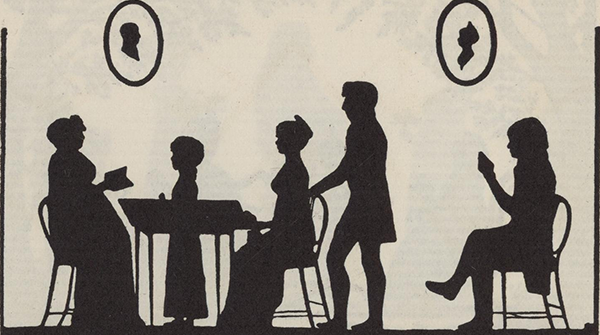 Siluettbilde av familien Koren. En av de «eligerte» som etter hvert flyttet til Bergen. Husfaren Wilhelm Frimann Koren Christie (1778-1849), spilte en avgjørende rolle i arbeidet med Grunnloven i 1814.