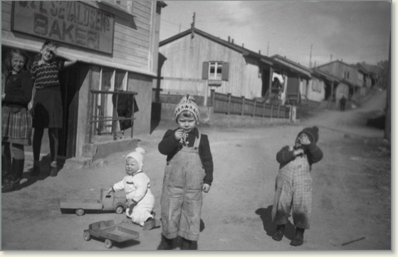 Bildet er tatt utenfor huset til Odd og Gunhild Aas nede i Gomagata. Vi ser oppover gata mot sommerfjøset på Strand Gård. Bildet må være tatt ca. 1943-1944. Vi ser noe av barakkebebyggelsen. Der de to jentene står på venstre side var det i kjelleren en bakerbutikk eid av Sevaldsen. I daglig tale kalt ”Kvitsevaldsen”, antagelig fordi huset var hvitmalt. Eier av bildet: Toralf Aas.