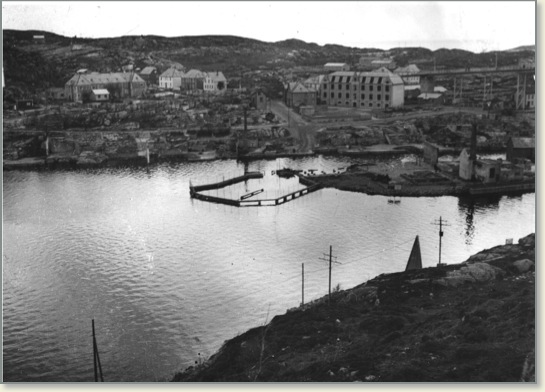 Dette historiske bildet må være tatt i begynnelsen av 2. verdenskrig, antagelig i 1942. Vi ser gomaskolen litt til høyre i bildet. ”Arken”, det store bygget helt til venstre. Min hustru Synnøve Ulseths barndomshjem ligger til venstre ved siden av Gomaskolen. Vi ser også noe av bebyggelsen i Freiveien som sto igjen etter tyskernes terrorbombing i aprildagene 1940. I midten Nordholmen som er utbombet sammen med bebyggelsen langs strandkanten. I bakkant til høyre sees barakkebebyggelsen som er under utførelse. En del av dem sto helt fram til 1960-årene da utbyggingen etter krigen etterhvert begyndte å bli ferdigstilt. Bildet må være tatt på Bjønnahaugen, ca. begynnelsen av 1942. Vi ser et glimt av den i forkant av dette bildet. Eier av foto: Anton F. Bjørlo.