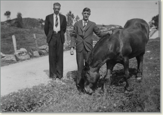 Fra 1939-1940 årene. Bildet tatt i bakkene nedover mot Strand Gård. Sommerfjøset ligger til høyre for bildet. I bakgrunnen til venstre ”Flaggstanghaugen”. Mannen til venstre er Ole Duaas som var dreng på Strand Gård. Han står sammen med Halvar Skrøen og hesten ”Bamse”. Eier av bildet: Toralf Aass.